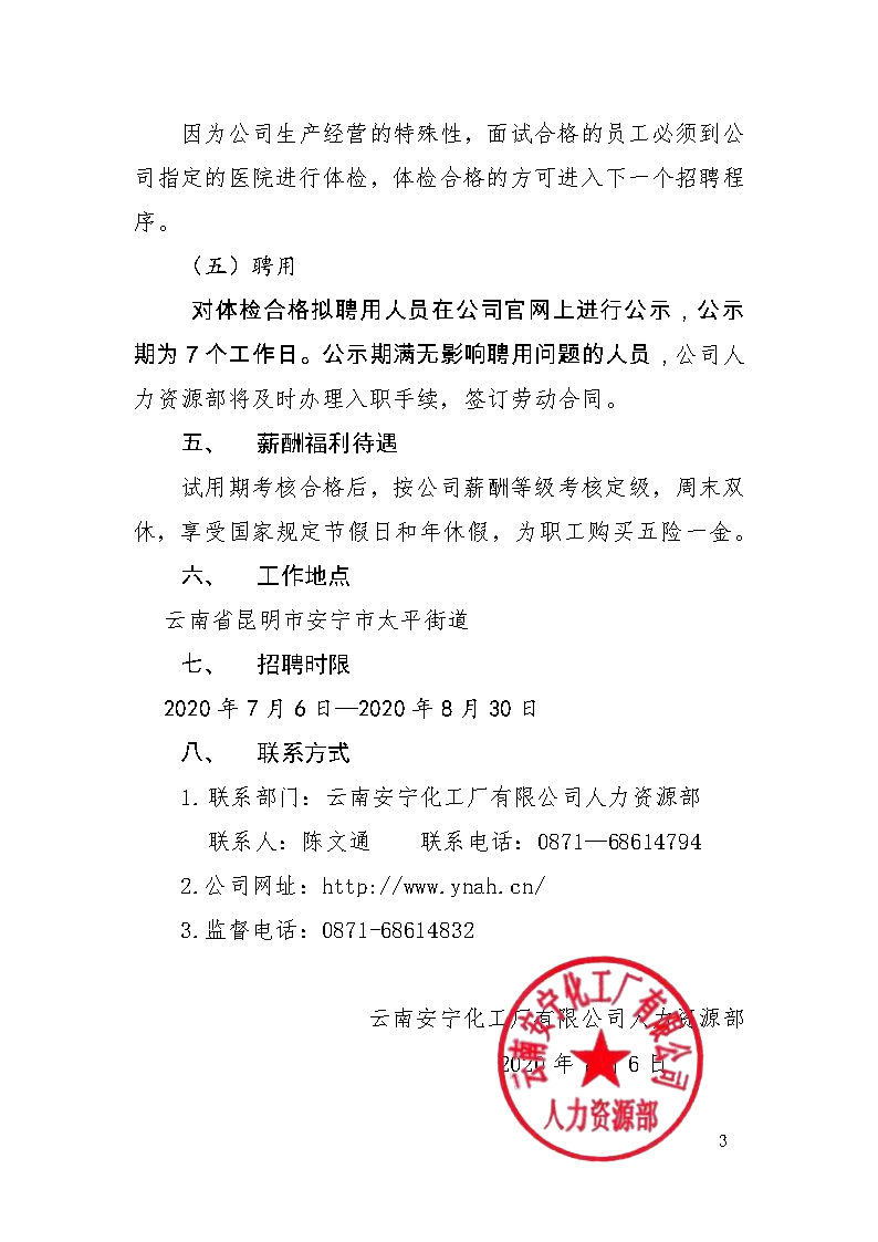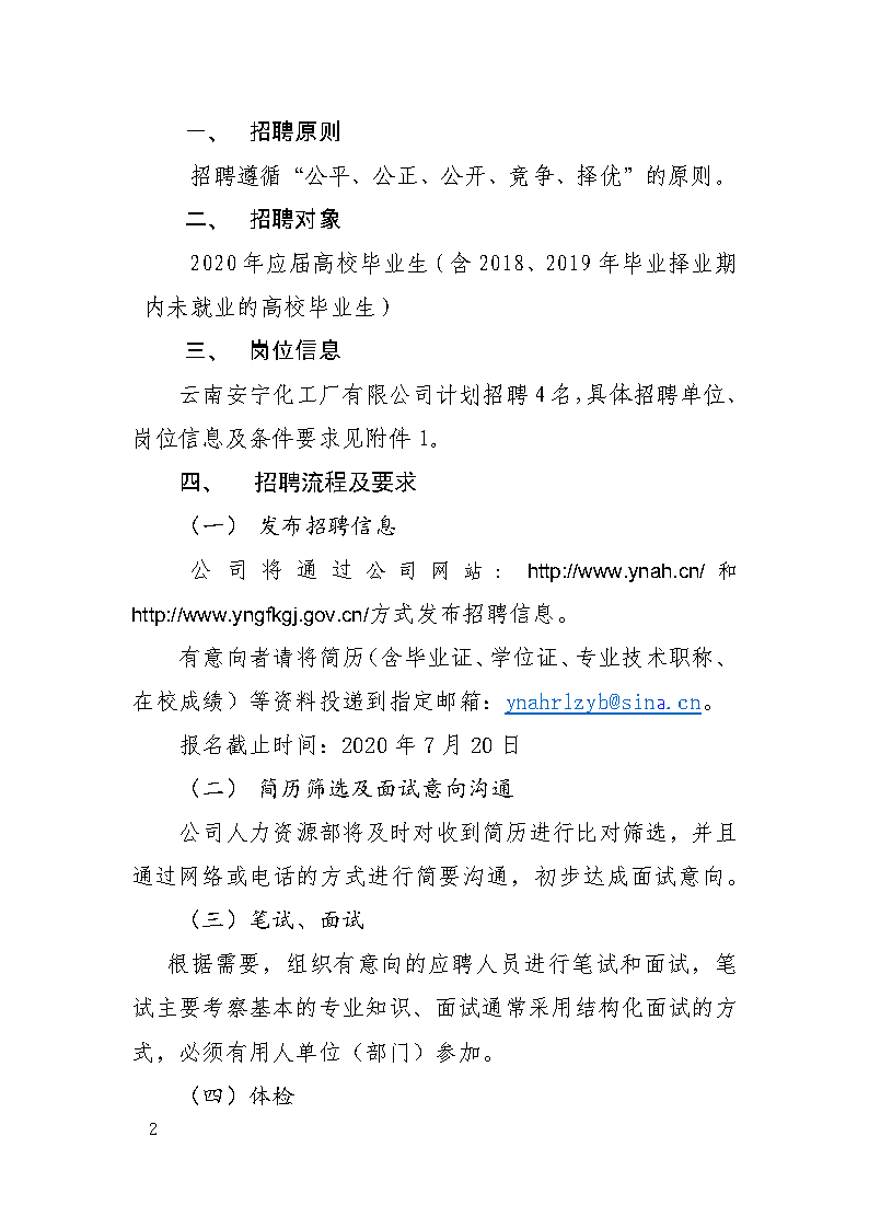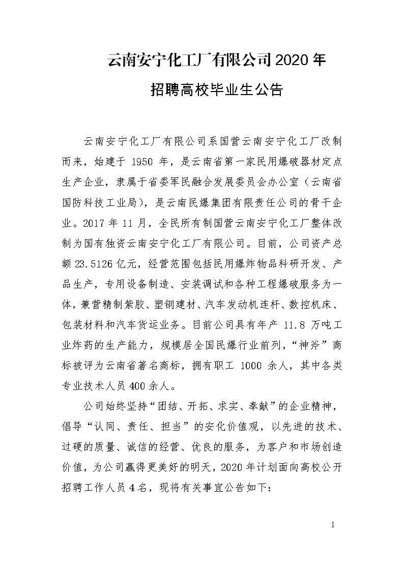 云南安寧化工廠有限公司2020年校園招聘公告