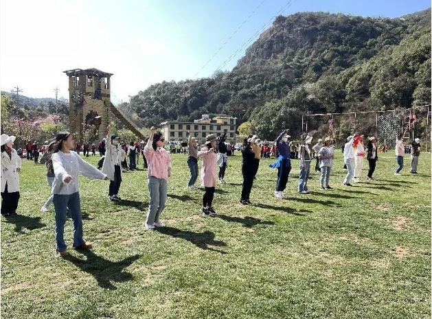 女職工們來(lái)到美麗的豹子箐,在教官的帶領(lǐng)下首先進(jìn)行合影留念、破冰行動(dòng)、熱身舞蹈。