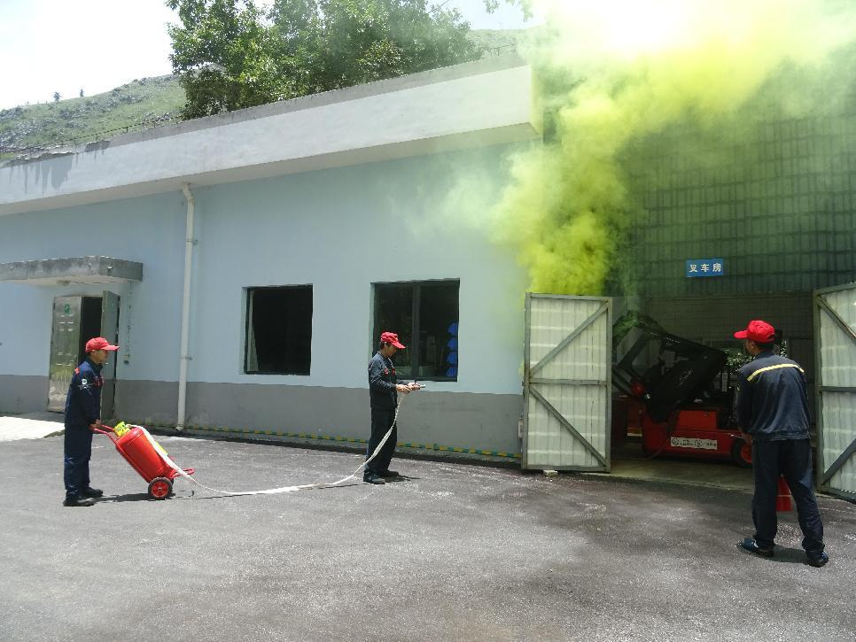 下午14,叉車充電突發(fā)火災(zāi)”,應(yīng)急演練正式開始。演練假設(shè)叉車在充電過程中電瓶起火,煙霧迅速彌漫。充電站旁的修理工房人員發(fā)現(xiàn)火情后,立即車間控制室和公司領(lǐng)導(dǎo)報告。接到報警后,公司迅速啟動滅火救援應(yīng)急處置預(yù)案,搶險救援人員立即攜帶現(xiàn)場配備的手推式干粉滅火器和手提式干粉滅火器趕赴現(xiàn)場進(jìn)行滅火,經(jīng)過5分鐘的緊急救援,叉車火情得到有效控制。