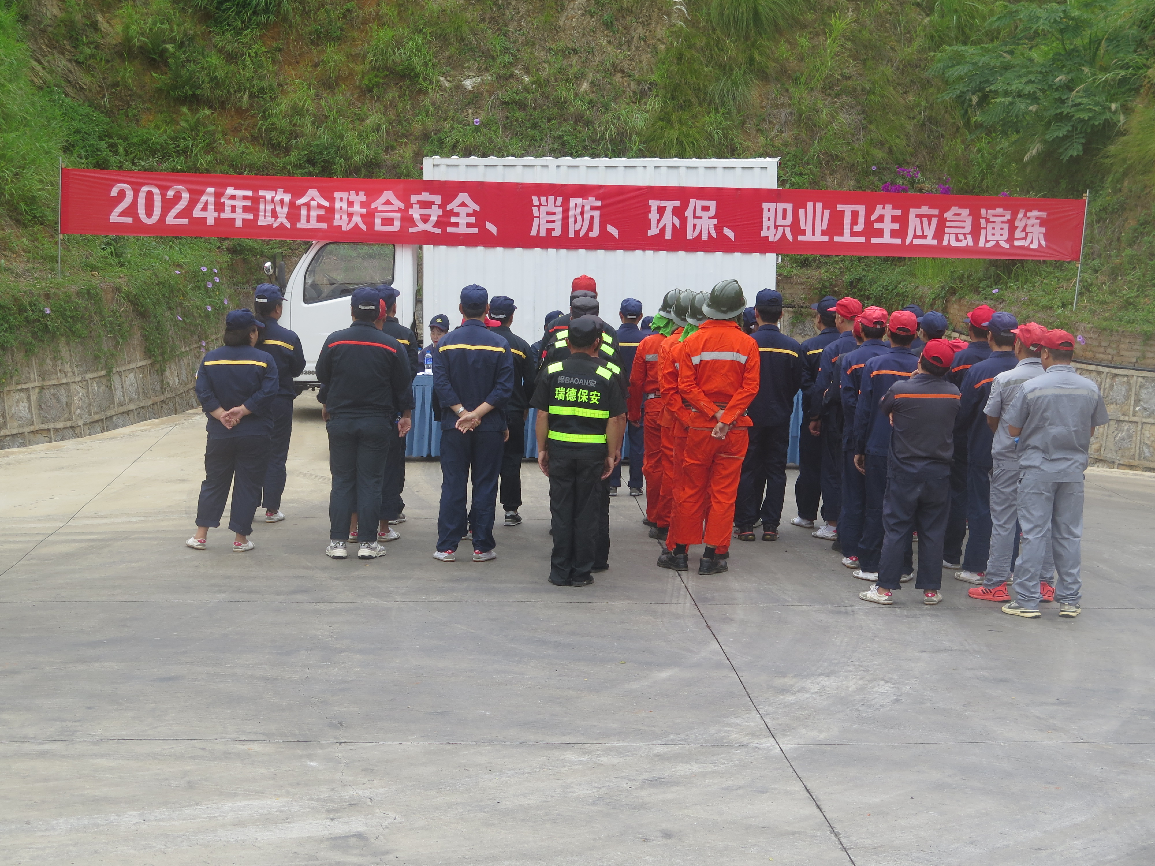 2024年6月25日,紅河州工業(yè)和信息化局、開遠(yuǎn)市工業(yè)商務(wù)和信息化局、云南安化有限責(zé)任公司開遠(yuǎn)分公司、內(nèi)蒙古瑞德保安服務(wù)有限公司聯(lián)合組織開展2024年度政企聯(lián)合安全、消防、環(huán)保、職業(yè)衛(wèi)生應(yīng)急演練。